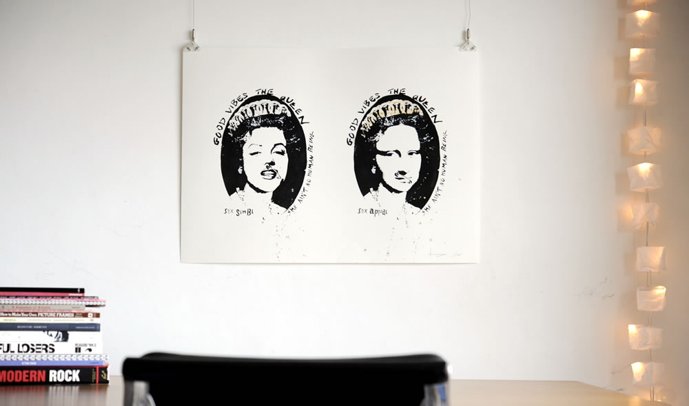 Jamie Reid/ジェイミーリードのGOD SAVE THE QUEENもKurryの手に掛かれば幸福感に包まれる作品に早変わり。イギリスの£10紙幣をパロった ‘Kurry’s Pound’ が18枚、貼り付けられた上からステンシルスプレーペイントされています。 サイズは小さいですが存在感の大きな作品です。 モナリサとモンロー、時代を超えて二人が並ぶとこんな感じ。