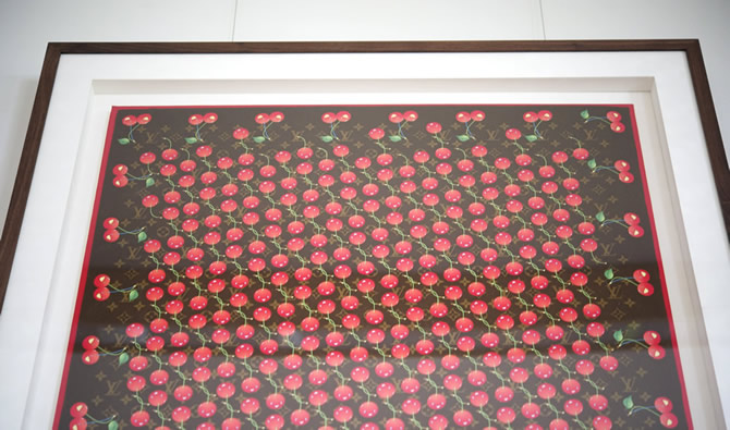 今まではお客様から持ち込まれたスカーフを額装するだけでしたが先日、あるお客様からご依頼いただいた額縁「WALNUT」で額装した「Louis Vuitton × 村上隆 チェリー」のスカーフがあまりにも魅力的で、この感動を画像だけで皆様とシェアするのはもったいないと考え、運良くスカーフを仕入れることも出来たので額装のセット販売を決断しました!