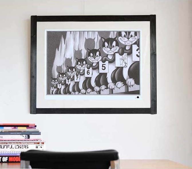 ビンテージの政治漫画、手書きのアニメーションから多大な影響を受け、グラファイト(鉛筆)のみで幾重にも重ねられたラインが生み出す緻密なイメージは戦争、政治、経済、暴力、性別、階級、宗教など人類が抱える不吉で重いテーマの題材をポップなコミック調で表現することで逆説的な関係を倍加させています。