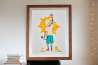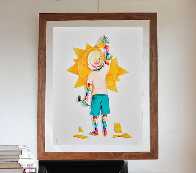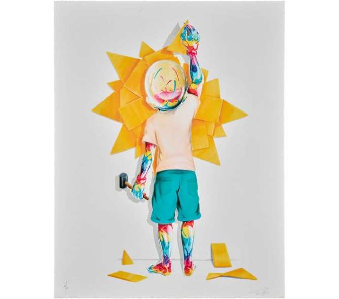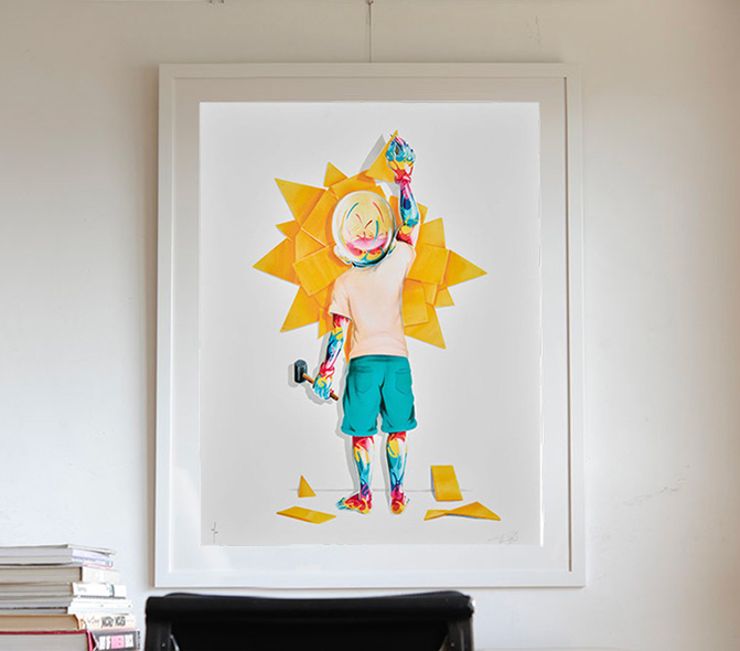 服こそ着ていますが、少年の体はすべてガラス張りで透けており、ガラス張りの体内にはカラフルで、生命力溢れたエネルギーに満ち溢れているように見えます。その少年は壁に日の出(Sunrise)を描いています。